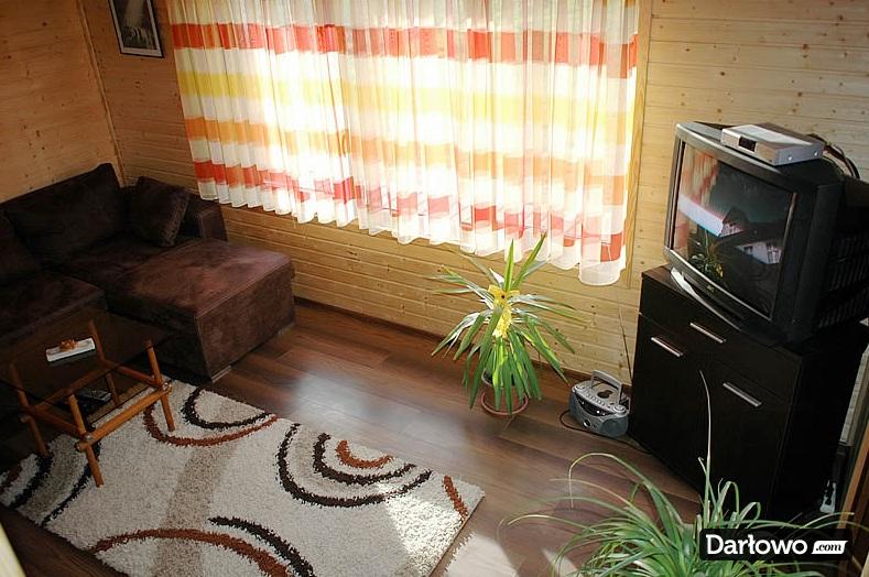 Pokój dzienny z aneksem obejmuje salonik z rozkładaną sofą narożną idealną do wypoczynku nocnego jak i relaksu w ciągu dnia, drewniany stół z krzesłami, a także aneks kuchenny zawierający płytę elektryczną 2-palnikową, lodówkę, zlewozmywak, czajnik, naczynia kuchenne